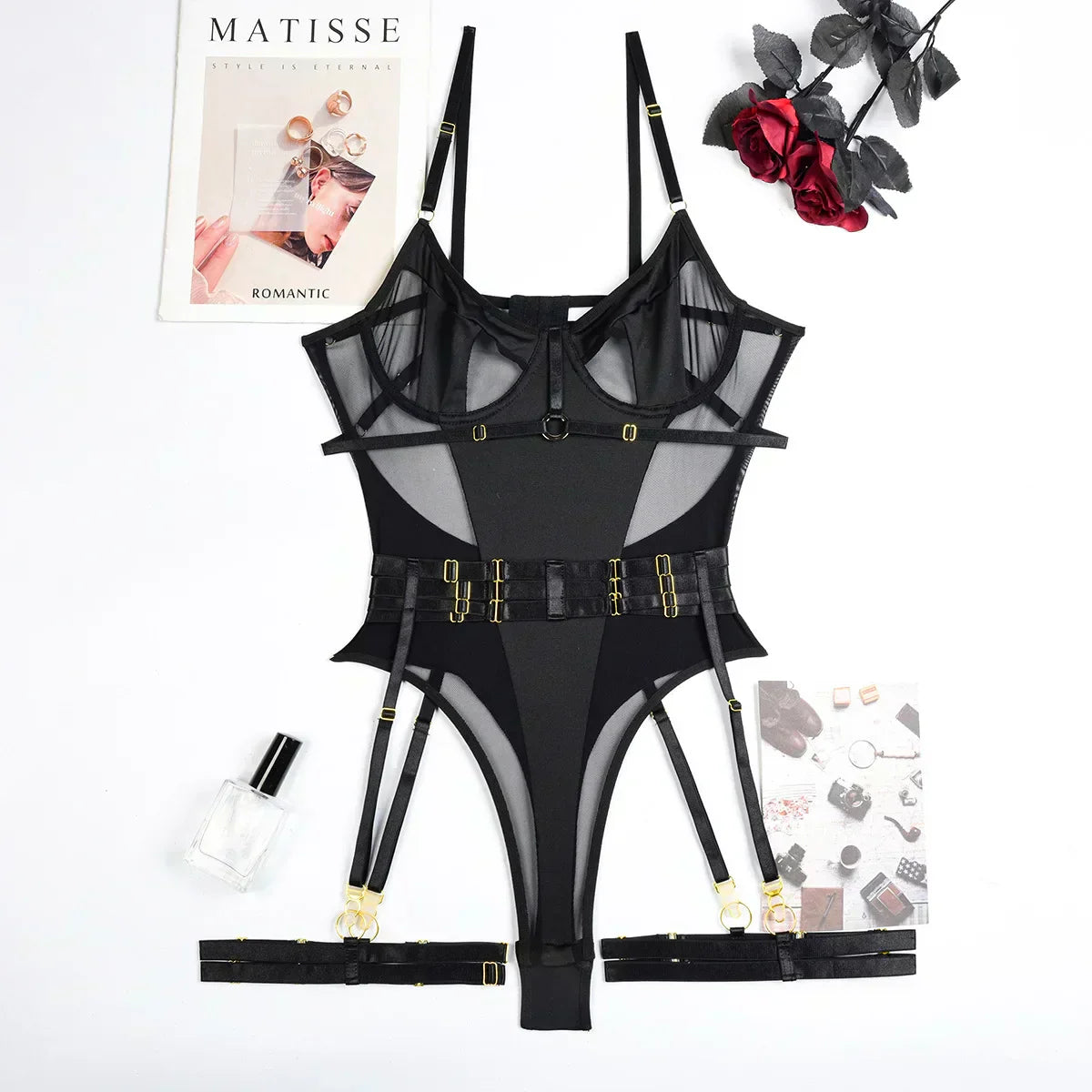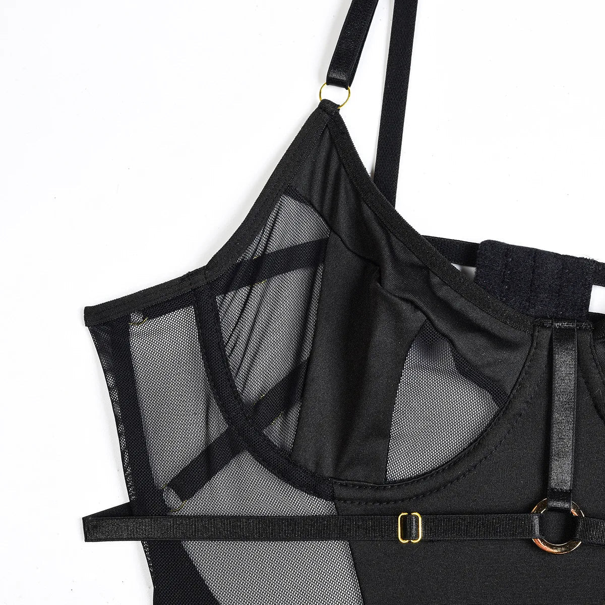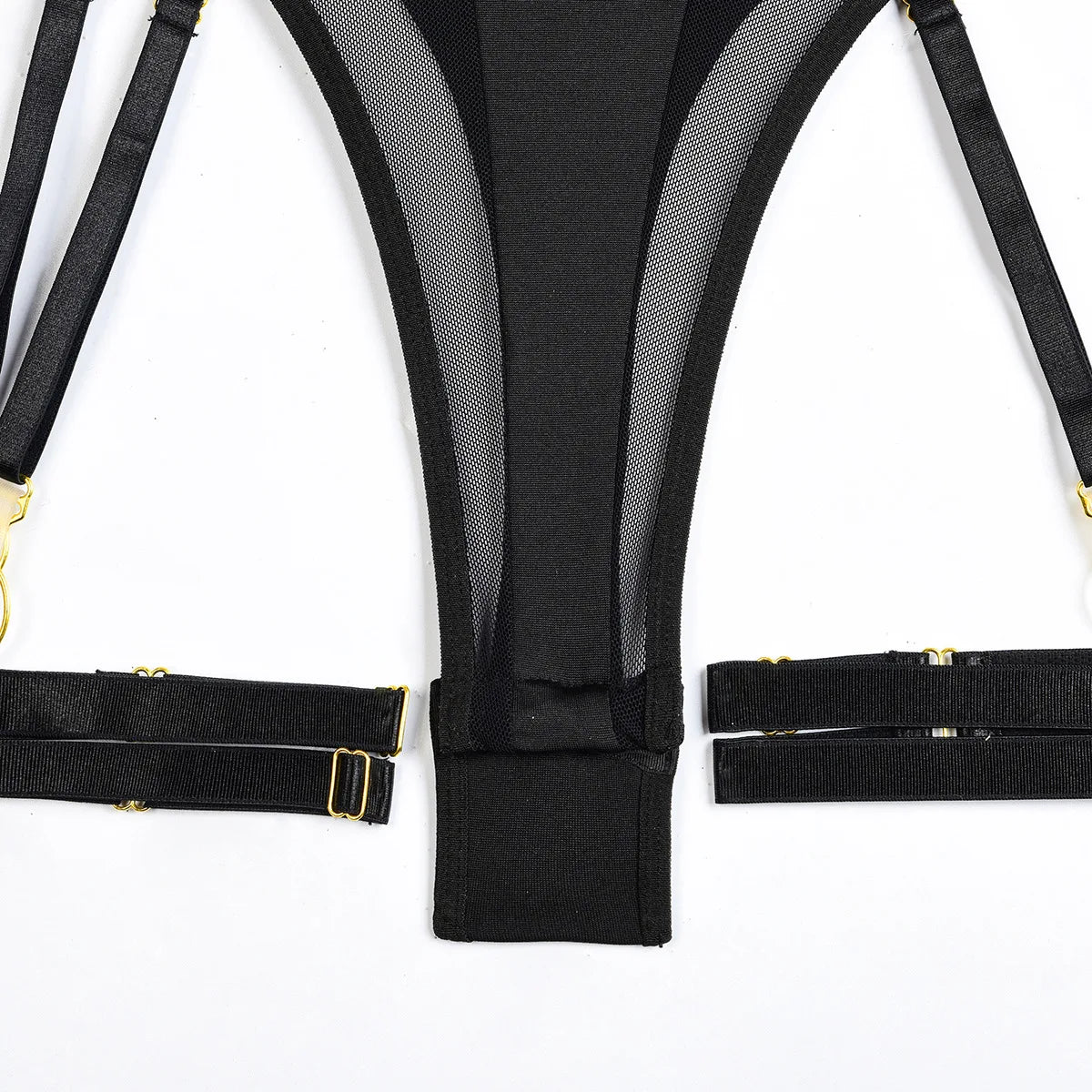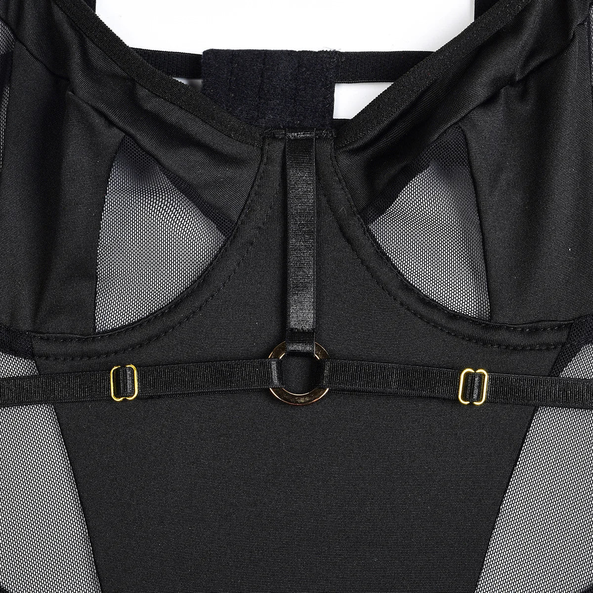 Der Rafaeli's Body ist eine Kombination aus Luxus und Attitüde. Mit transparenten Mesh-Einsätzen, verstellbaren Trägern und raffinierten goldenen Details strahlt dieser Body pure Stärke und Verführung aus. Ideal für Frauen, die keine Angst haben, ihre starke, sinnliche Seite zu zeigen.