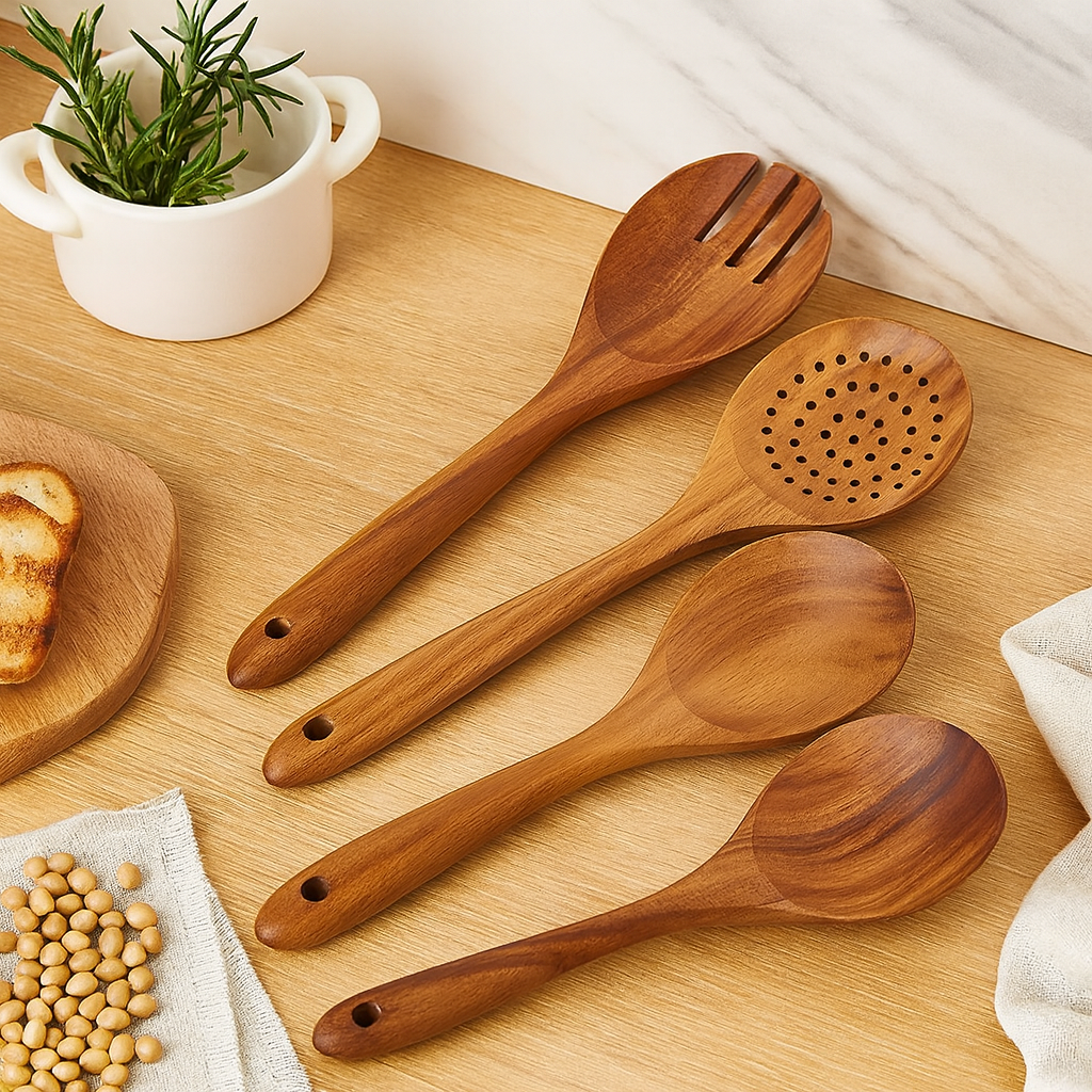 Vom Rühren und Schöpfen bis zum Wenden und Servieren – jedes Utensil erfüllt eine klare Aufgabe. Das Holz schützt beschichtetes Kochgeschirr und sorgt für angenehmes Kochen im Alltag.