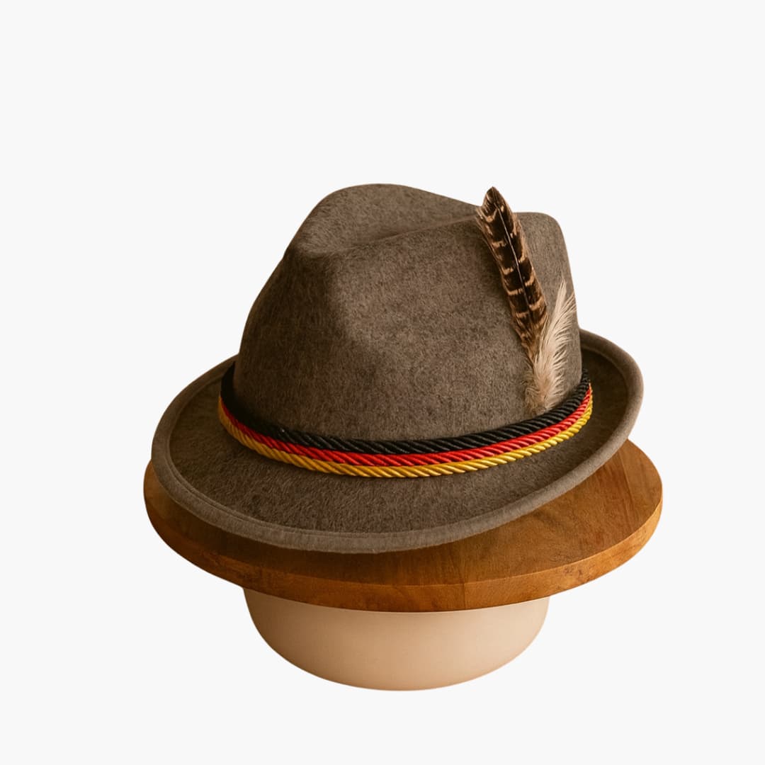 Ein klassischer Kopfschmuck im bayerischen Trachtenstil mit charakteristischer Form und dekorativer Feder. Geeignet für Herren, die bei Festen wie dem Oktoberfest oder anderen kulturellen Anlässen ein passendes Accessoire tragen möchten. Die formstabile Struktur sorgt für eine gleichbleibende Form während des Tragens.