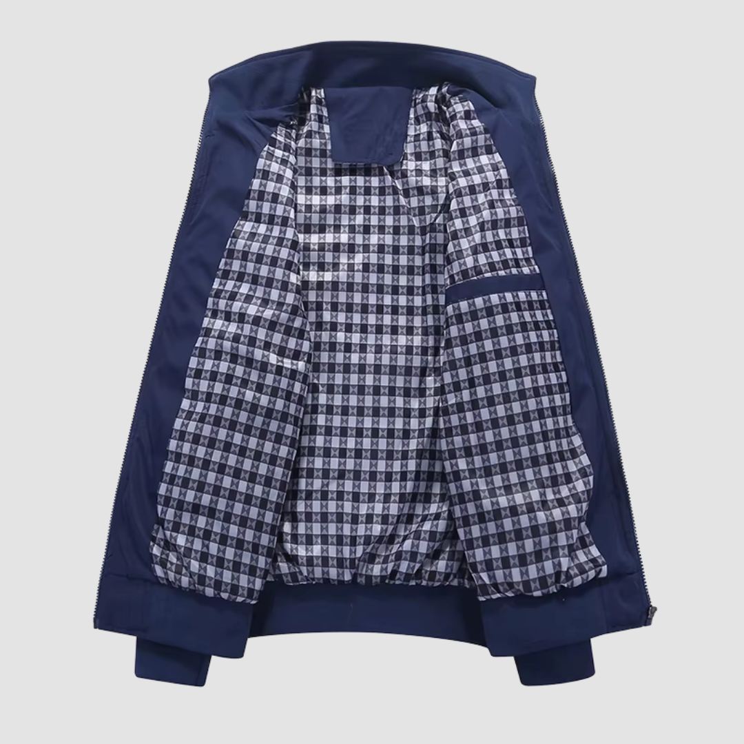 Diese Bomberjacke für Herren kombiniert eine moderne Silhouette mit praktischen Funktionen. Der hohe Stehkragen und der durchgehende Reißverschluss verleihen ihr eine markante Optik, während die kariert gefütterte Innenseite einen stilvollen Kontrast bietet. Perfekt für einen entspannten, aber gepflegten Look.