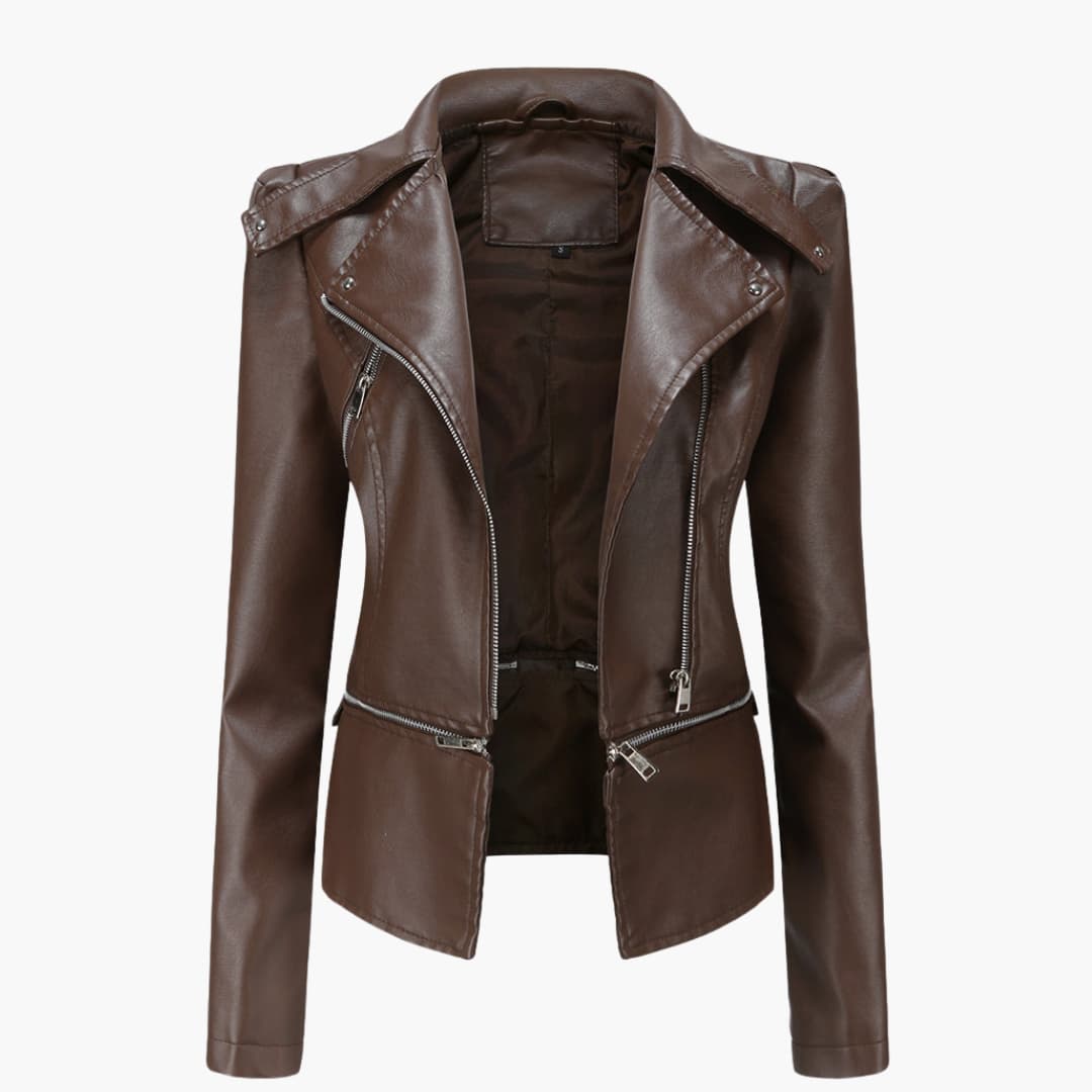 Damenjacke im Biker-Stil mit Reverskragen und Reißverschlusstaschen.