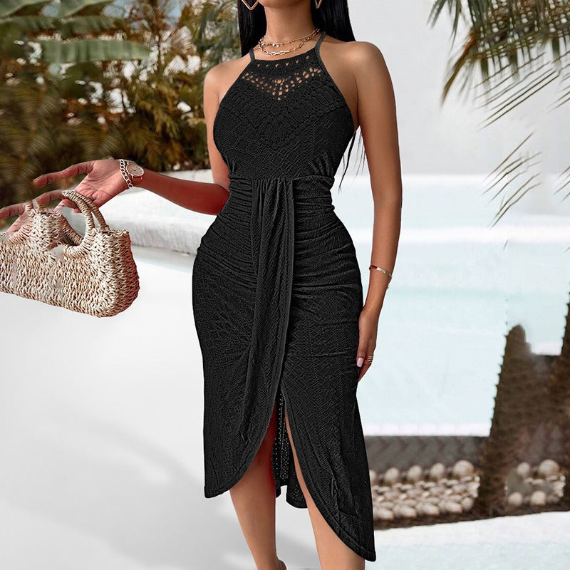 Der taillierte Schnitt mit Neckholder-Ausschnitt verschlankt Hals und Schultern, während der vordere Schlitz für Dynamik und Bewegung sorgt. Ideal für Spaziergänge am Meer, sommerliche Abendessen oder Ausflüge an warme Orte.