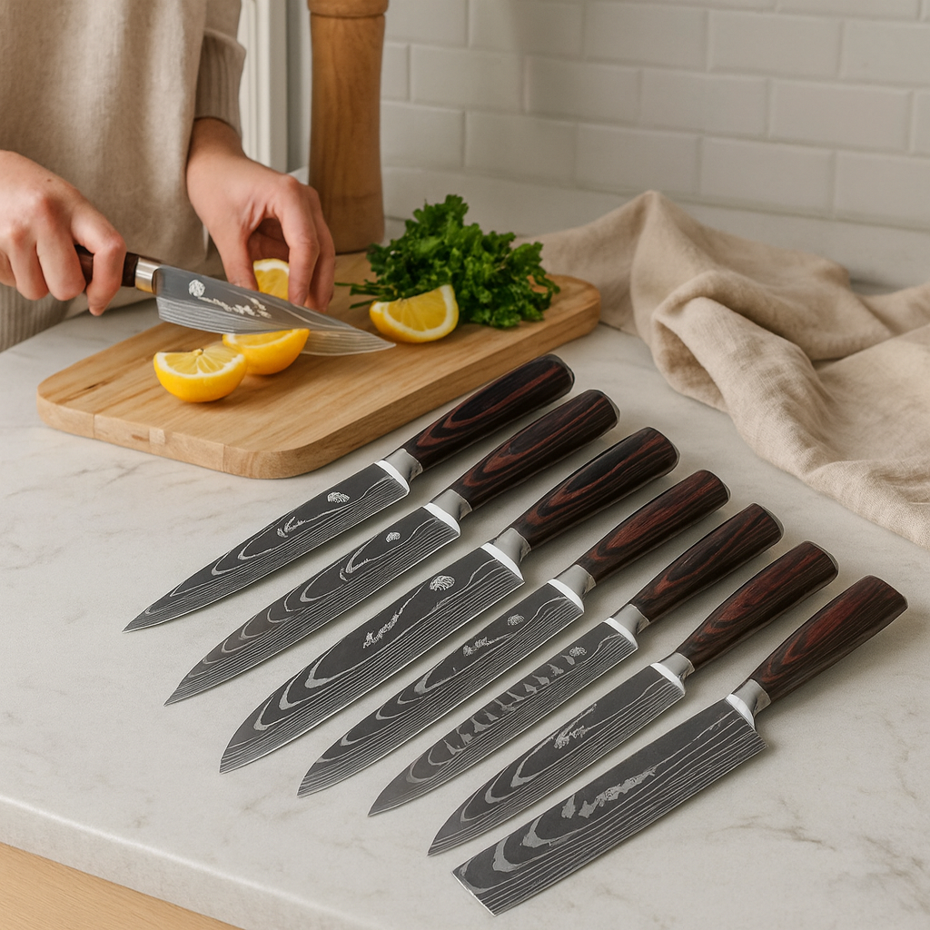 Komplettes 8-teiliges Set – inklusive Kochmesser, Brotmesser, Tranchiermesser, Allzweckmesser, Schälmesser und mehr.