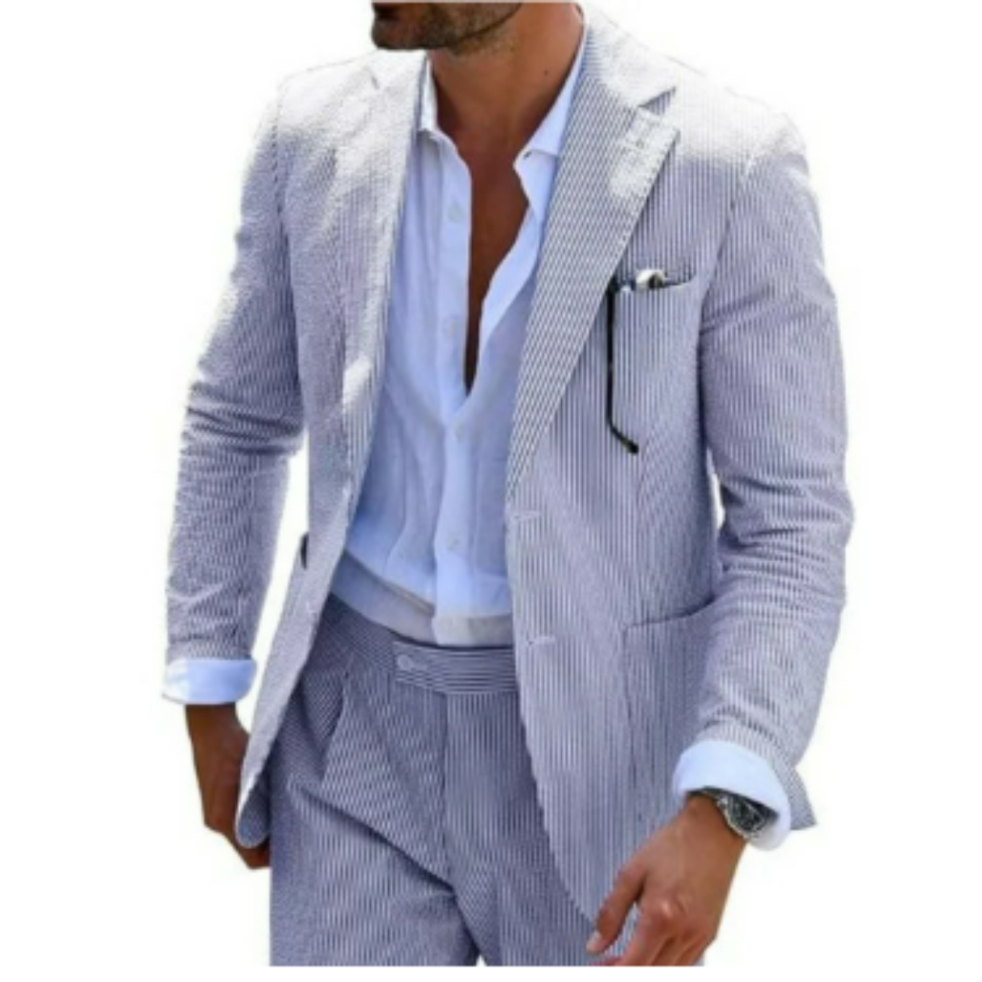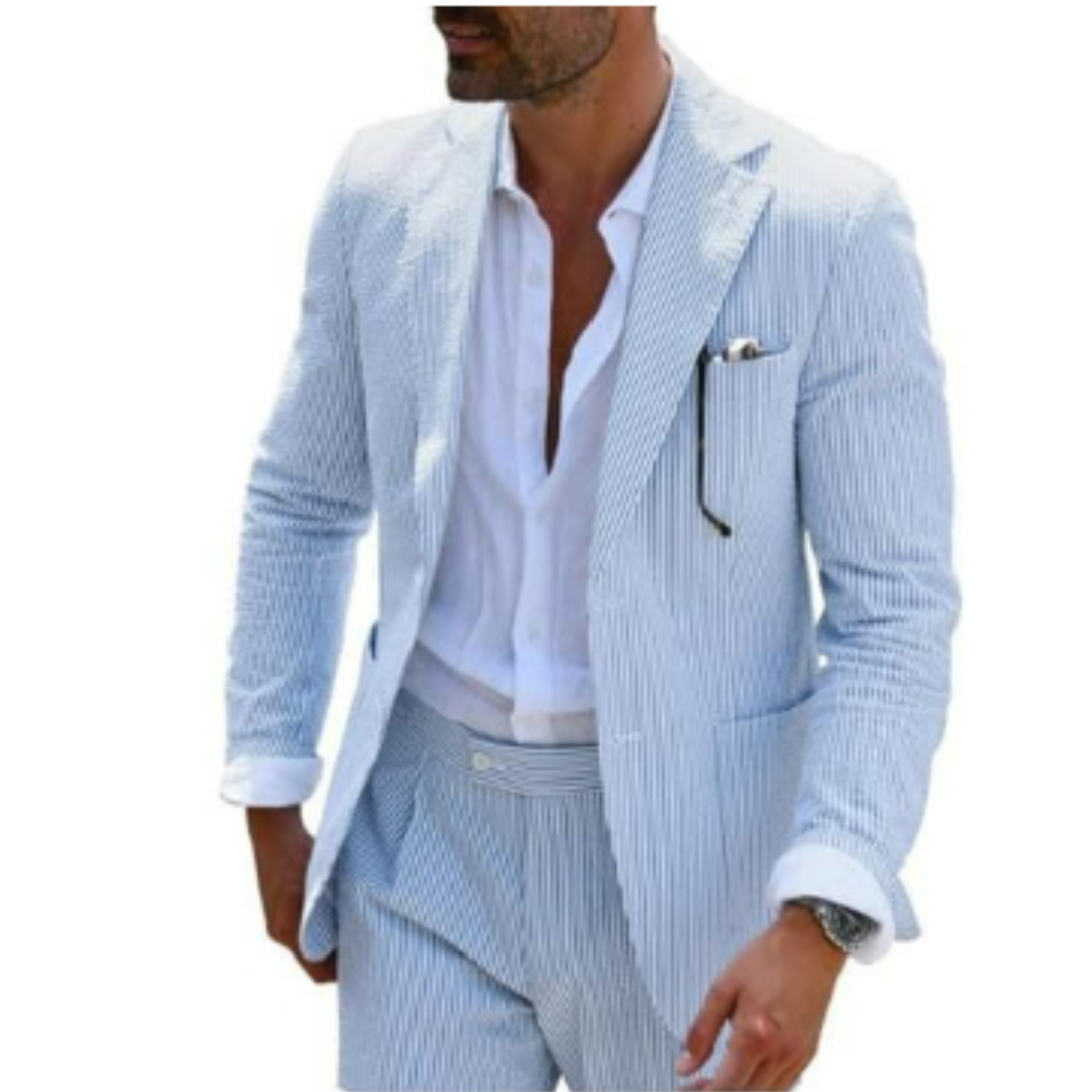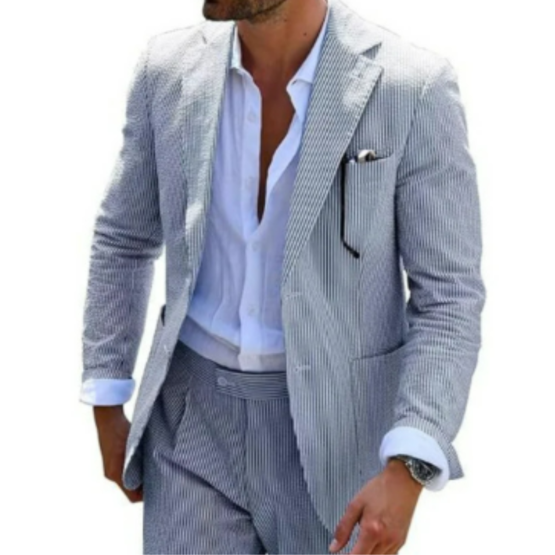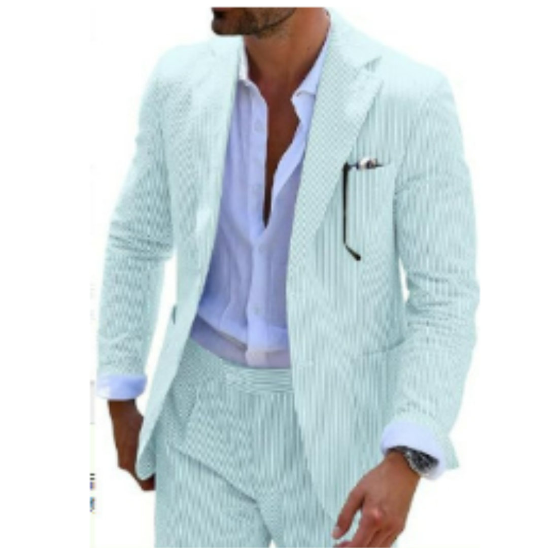 Dieser zweireihige Sommeranzug ist der Inbegriff moderner Eleganz. Die leichte Stoffqualität und das markante Design machen ihn zum perfekten Begleiter für Hochzeiten und feierliche Anlässe bei warmem Wetter. Mit seiner edlen Knopfleiste und dem klassischen Schnitt hebt er jeden Look auf das nächste Level.