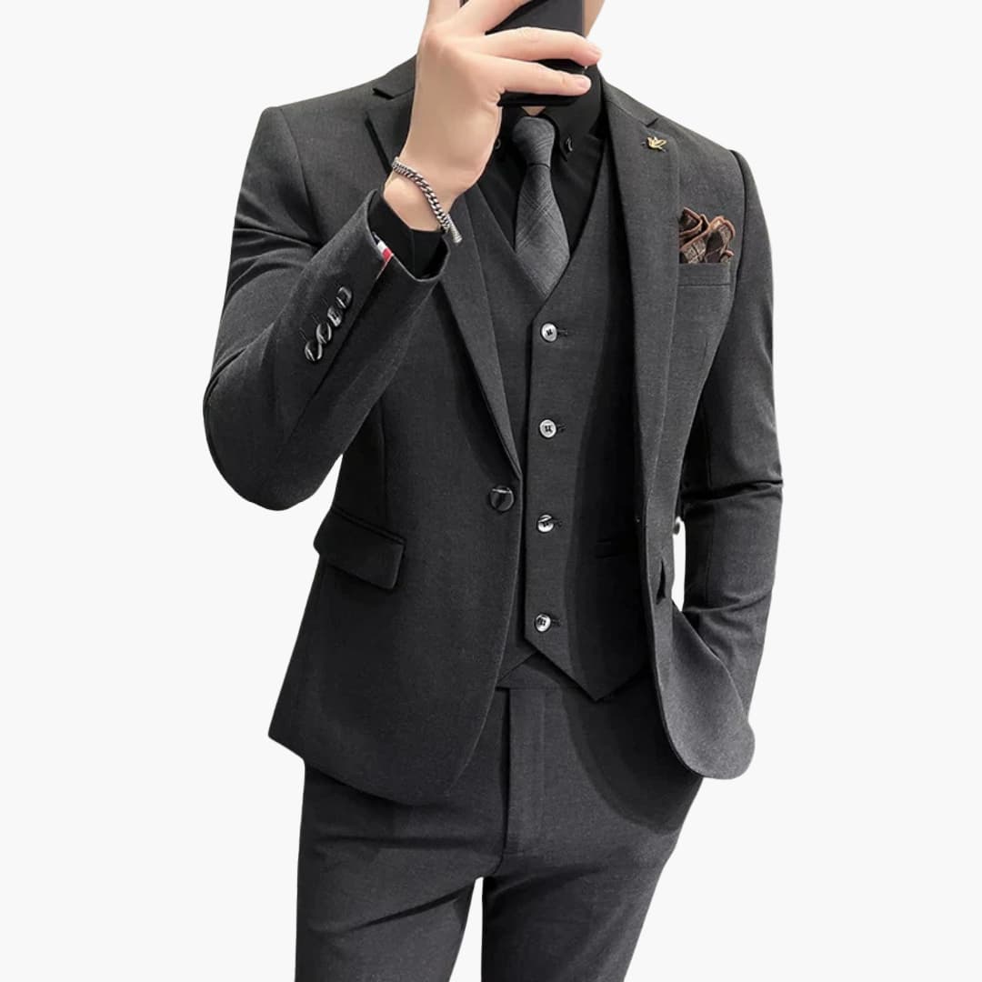 Dieser Herrenanzug besteht aus einem leichten, atmungsaktiven Material und eignet sich für den ganzjährigen Einsatz. Er umfasst ein langärmliges Sakko mit Knopfleiste, eine passende Weste und eine klassische Anzughose. Die schmale Passform und das Revers mit Kerbe machen ihn geeignet für Business- und formelle Anlässe.