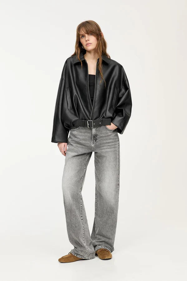 Bereichere deine Garderobe mit der KINA Jacke – einer oversized geschnittenen Jacke aus butterweichem veganem Leder. Sie verfügt über einen eleganten Frontreißverschluss und einen schicken Gürtel am Saum, mit dem du deinen Look individuell definieren kannst.