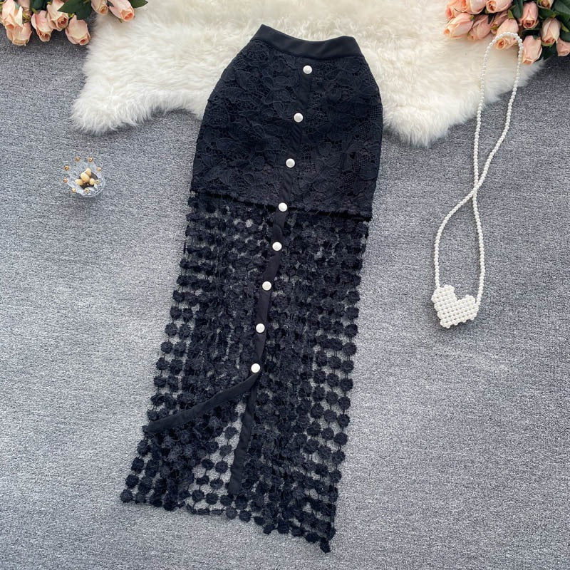 Dieser lange Rock vereint Eleganz und Handwerkskunst. Er ist aus zarter, floraler Spitze gefertigt und hat eine halbtransparente Struktur mit dreidimensionalen Applikationen und einer Reihe von Knöpfen auf der Vorderseite. Der Kontrast zwischen dem dicht gewebten Stoff im oberen Bereich und der offenen Stickerei im unteren Bereich schafft eine raffinierte Silhouette mit Charakter. Ideal für besondere Anlässe oder sommerliche Styles mit romantischem Flair.