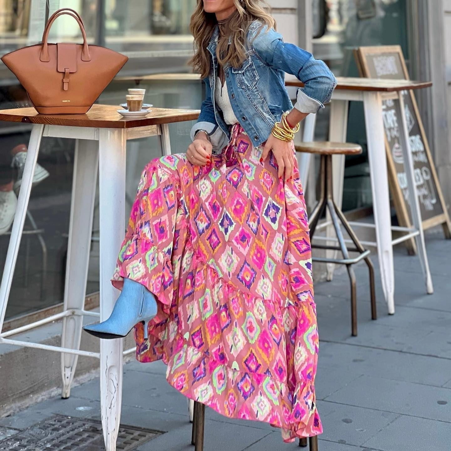Bohème-inspirierter langer Rock mit auffälligem Paisleymuster in leuchtenden Farbtönen. Der fließende Stoff mit seinem natürlichen Faltenwurf und dem gerüschten Design bringt Bewegung und Frische in jeden Schritt.