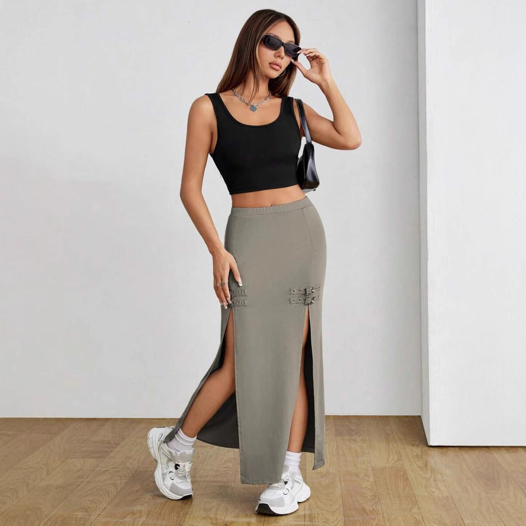 Dieser lange Damenrock kombiniert eine schmale Passform mit hohen Seitenschlitzen und dekorativen Schnallendetails für einen modernen, kantigen Look, ohne auf Eleganz zu verzichten. Der weiche, dehnbare Stoff liegt eng am Körper an und lässt viel Bewegungsfreiheit, ideal für urbane Looks mit Persönlichkeit.