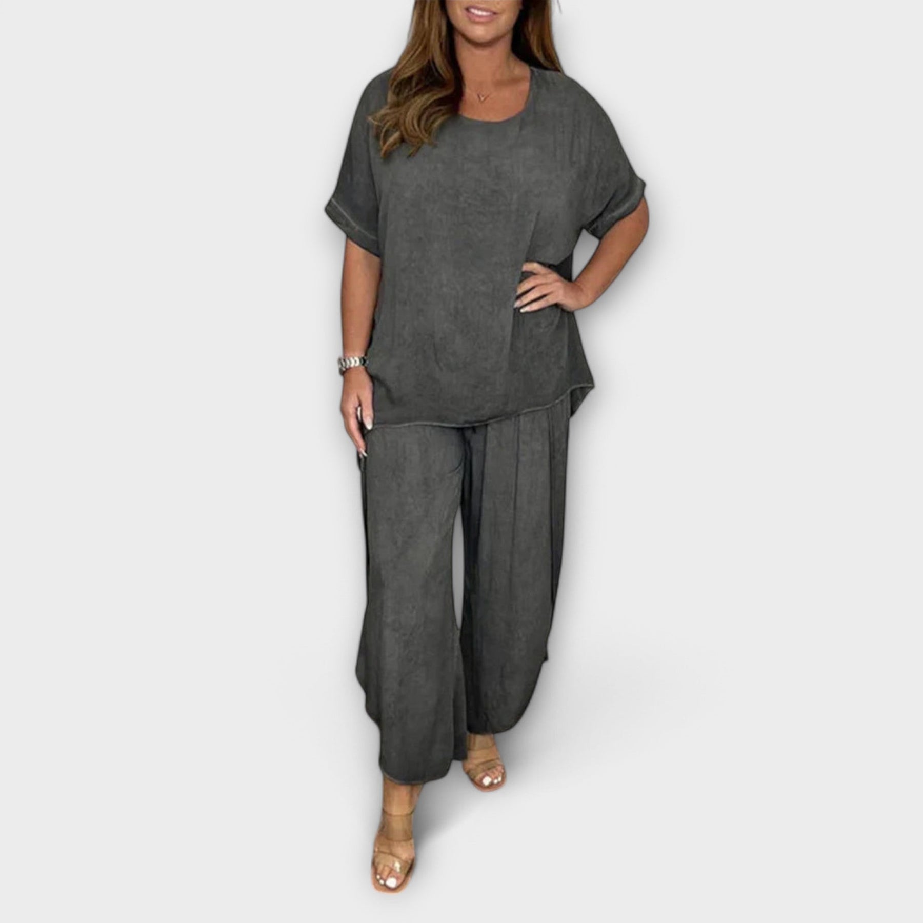 Entdecken Sie unseren bequemen und entspannten Zweiteiler, der schlichte Eleganz mit maximalem Komfort vereint. Perfekt für den Alltag, kombiniert dieses Ensemble ein lockeres Oberteil mit einer lässigen langen Hose – ideal für Frühling, Sommer und Herbst.
