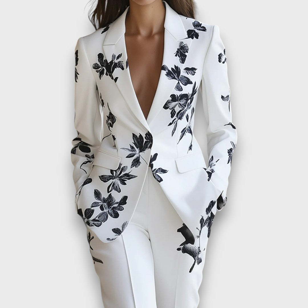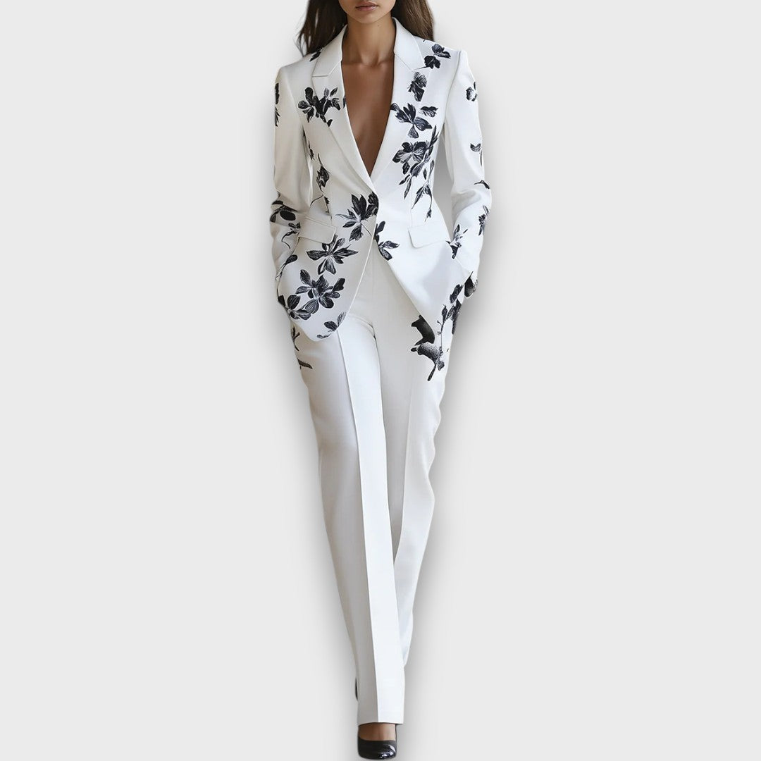 Meliora vereint schlichte Eleganz mit ausdrucksstarkem Design. Der weiße Stoff schenkt Klarheit und Raffinesse, während die schwarzen floralen Akzente dem Ensemble Tiefe und Charakter verleihen. Die taillierte Passform betont die Figur, ergänzt durch eine gerade geschnittene Hose, die Anmut und Stärke ausstrahlt. Ein Hosenanzug, der Modernität und zeitlose Eleganz in perfektem Gleichgewicht trägt.