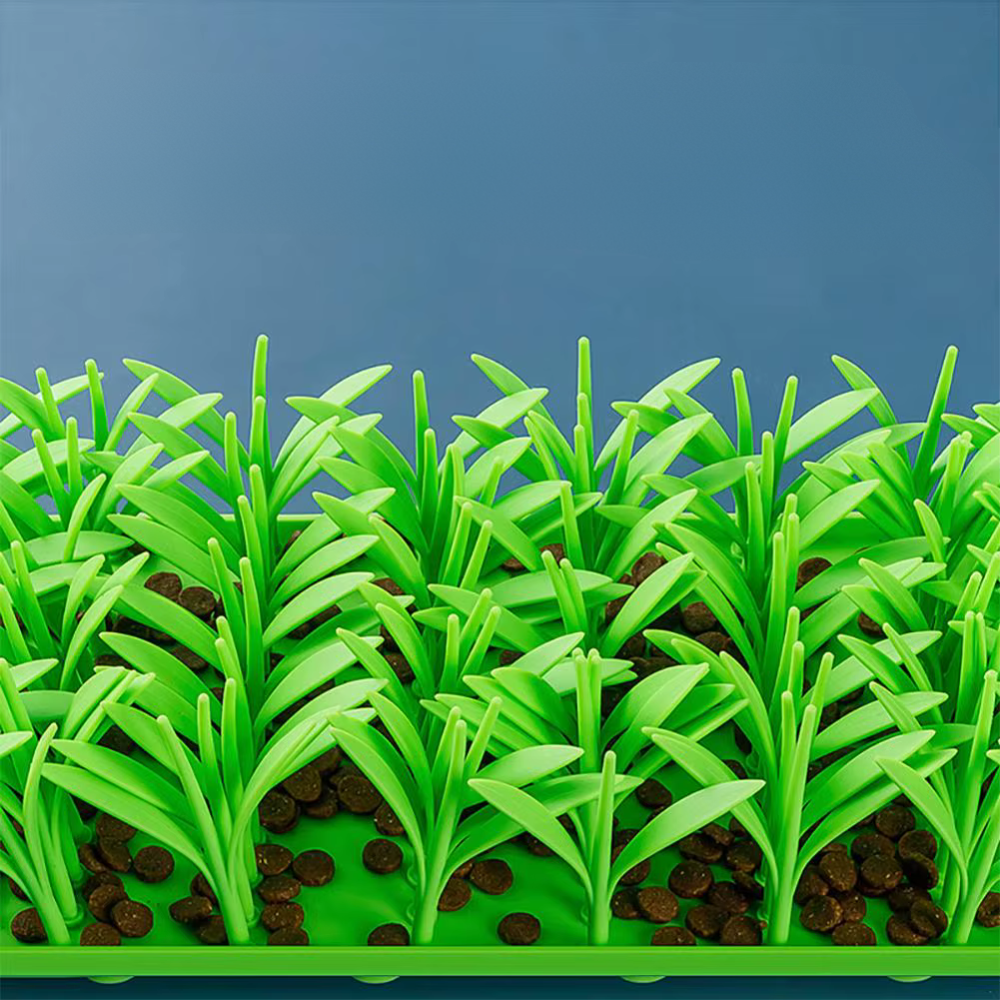 Die PfotenMatte™ Pet Mat ermutigt Ihr Haustier langsam zu fressen, während andere Leckmatten oft schnelles Fressen fördern, was das Risiko von Verdauungsstörungen und Unwohlsein senkt. Das Grasdesign fordert Ihr Haustier geistig heraus und macht jede Mahlzeit unterhaltsam und anregend!