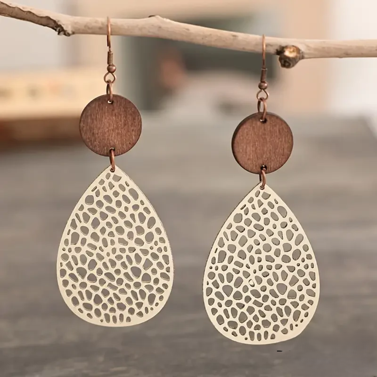 Leicht wie ein Sommerwind: Diese Ohrhänger verbinden organische Formen mit filigranem Muster und natürlicher Wärme. Ein Hauch Boho-Chic für stilvolle Alltagsmomente.