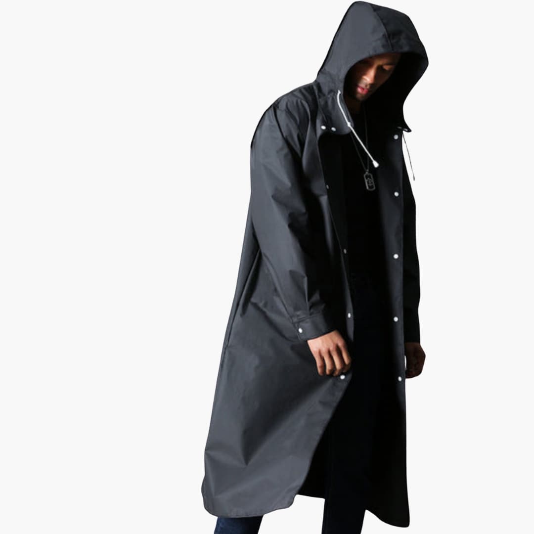 Regenmantel für Herren mit Kapuze und durchgehendem Knopfverschluss zum Schutz.