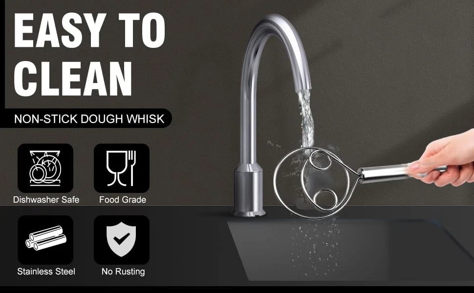 Einfach zu reinigen: Unser dänischer Teigmischer ist aus lebensmittelechtem Edelstahl mit glatter Oberfläche gefertigt, Teig sammelt sich nicht am Drahtkopf, einfach nach der Benutzung mit Wasser abspülen, um Teigreste zu entfernen.